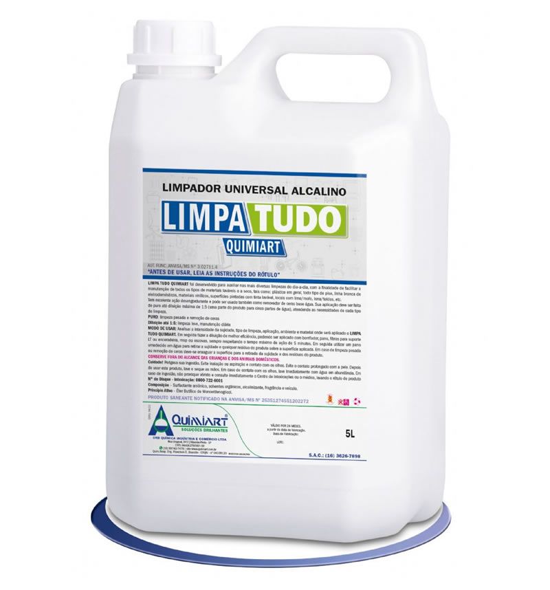 LIMPA TUDO QUIMIART foi desenvolvido para auxiliar nas mais diversas limpezas do dia-a-dia, com a finalidade de facilitar a manutenção de todos os tipos de materiais laváveis e a seco, tais como: plástico em geral, todo tipo de piso, linha branca de eletrodomésticos, materiais vinílicos, superfícies pintadas com tinta lavável, locais com limo/mofo, lona/toldos, etc. Tem excelente ação desengordurante e pode ser usado também como removedor de ceras base água. Sua aplicação deve ser feita de puro até diluição máxima de 1:5 (uma parte do produto para cinco partes de água), atendendo as necessidades de cada tipo de limpeza. PURO: limpeza pesada e remoção de ceras Diluição até 1:5: limpeza leve, manutenção diária MODO DE USAR: Analisar a intensidade da sujidade, tipo de limpeza, aplicação, ambiente e material onde será aplicado o LIMPA TUDO QUIMIART. Em seguida fazer a diluição de melhor eficiência, podendo ser aplicado com borrifador, pano, fibras para suporte LT ou enceradeira, mop ou escovas, sempre respeitando o tempo máximo de ação de 5 minutos. Em seguida utilizar um pano umedecido em água para retirar a sujidade e qualquer resíduo do produto sobre a superfície aplicada. Em caso de limpeza pesada ou remoção de ceras deve-se enxaguar a superfície para a retirada da sujidade e dos resíduos do produto.