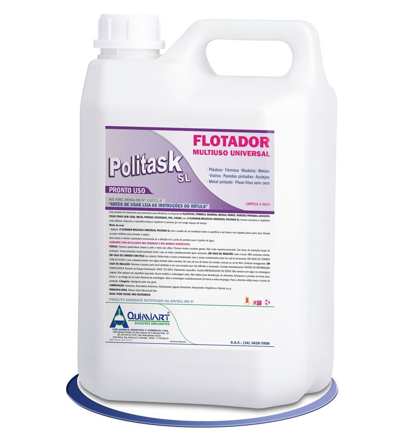 Este produto foi elaborado para promover uma eficiência na limpeza de PLÁSTICOS, FÓRMICA, MADEIRA, METAIS, VIDROS, PAREDES PINTADAS, AZULEJOS, PISOS FRIOS SEM CERA, METAL PINTADO, ESTOFADOS, PVC, COURO, etc. O FLOTADOR MULTIUSO UNIVERSAL POLITASK SL remove manchas e sujidades mais difíceis, deixando a superfície limpa e repelente à poeiras por um longo espaço de tempo.