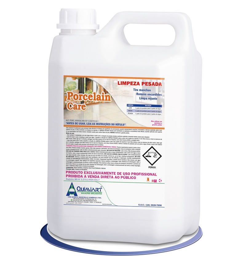 Este produto foi elaborado para remover total eficácia na limpeza de superfícies de porcelanato, quando apresentarem manchas, encardidos e demais sujidades após o uso intenso do piso. É eficaz também na limpeza de rejuntes. O